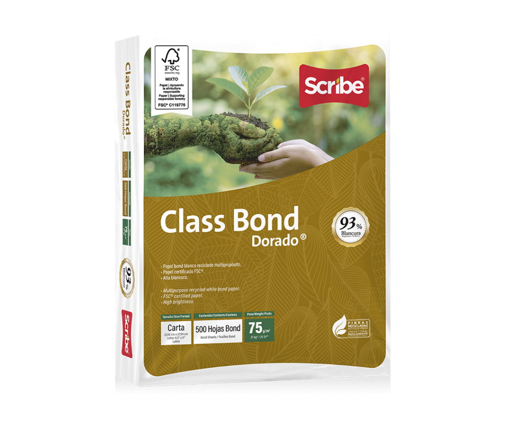 Class Bond Dorado® es un papel bond reciclado multipropósito de alta blancura y está certificado por la FSC® contribuyendo a la integridad de los bosques, su productividad y protección de las especies. Fabricado a partir de una mezcla de energía proveniente de fuentes renovables y convencionales.
