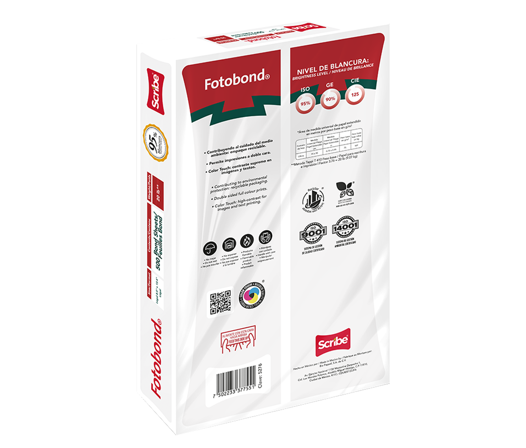 Fotobond® es nuestro papel bond blanco, elaborado con fibras sustentables con la precisión necesaria para un mejor rendimiento en fotocopiado e impresión. Cuenta con niveles balanceados de humedad, formación y suavidad para responder a la combinaicón de calor y presión en los diferentes dispositivos de impresión.